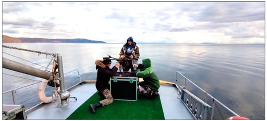The objects of this study are highly steep slopes prone to rockfalls and scree, common in the territory within the boundaries from 72 km to 152 km of the Circum-Baikal Railway. The case study area shown in this paper is located at the 143rd km of the railway. The slope under consideration runs for 300 m along the rails. The inaccessibility of steep rocks can be overcome by using a UAV launched from the deck of a boat (Figure 3). The use of a UAV eliminates the need for personnel to physically access these hazardous areas.