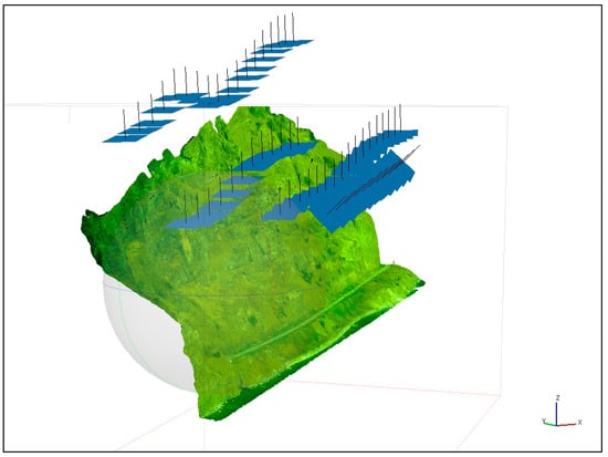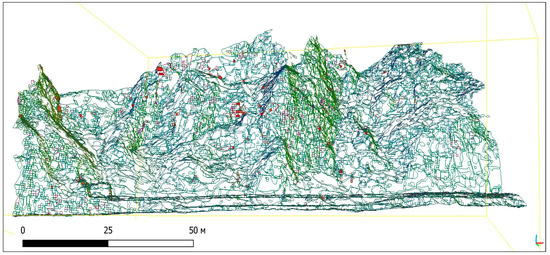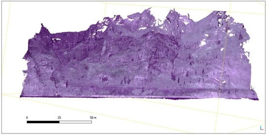 After receiving the survey data, the photogrammetric processing of images was carried out using SfM-MVS photogrammetry in Agisoft PhotoScan []. The Structure-from-Motion (SfM) algorithm utilised various techniques, such as feature detection and matching, to establish correspondences between the images. These correspondences were then used to estimate the camera poses and triangulate the 3D points (Figure 4). The “high quality” setting ensured a more precise alignment of the images, while “reference preselection” helped in selecting reliable reference points for the alignment process []. As a result, a dense cloud of points was obtained, that is, a set of object surface vertices that are determined by the X, Y, and Z coordinates (Figure 5). The resulting point cloud and mesh were then visually inspected for accuracy and completeness. The inspection involved checking for any outliers or inconsistencies in the point cloud data. Additionally, the mesh was examined to ensure that it accurately represented the object’s surface topology and geometry. Next, a height map, a DSM, and an orthomosaic were built. Discontinuities can all be extracted using three-dimensional models that are generated from SfM [].