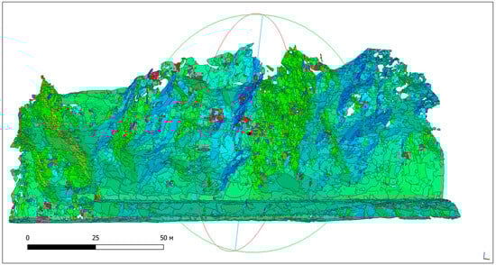 The Fast Marching algorithm yielded faster processing and showed proper results (Figure 7). The point cloud was divided into smaller cells, which then computed basic planar objects and gradually aggregated them into polygons based on a planarity threshold. A tension parameter was used to modify the polygonal bounds surrounding segmented points. The location and direction of six of the primary families of discontinuities in the rocky massif may be determined using this semi-automatic method [].