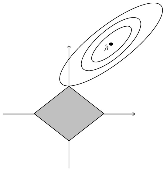 Here is a tuning parameter which can control the shrinkage applied to the estimates. Let . Values of will cause shrinkage of the solutions towards zero, and some coefficients may be exactly zero [33]. Figure 2 is the estimation picture for the Lasso. It is clear from Figure 2 that Lasso can produce coefficients equal to zero.