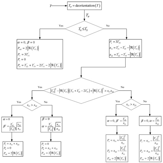 The flowchart of the proposed decomposition is shown in Figure 4. denotes the power of Odd component; indicates the power of Dbl component; denotes the power of Vol component; and indicates the power of Od component. The superscript indicates the element of the coherence matrix after rotation. The details will be illustrated as follows.