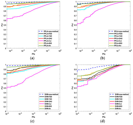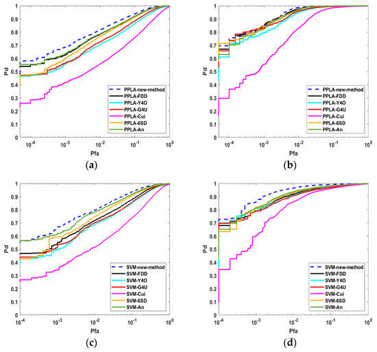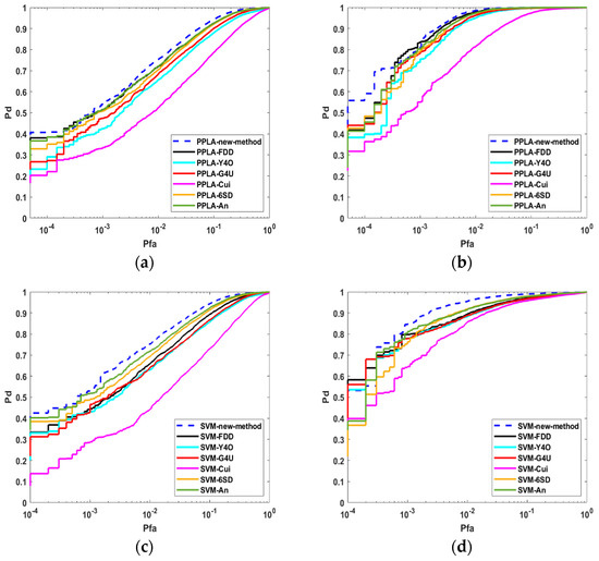 ROC curves in the selected AIRSAR image are shown in Figure 14. Table 8 and Table 9 independently show the AUC of PPLA and the AUC of SVM. There is little difference between the model-based approaches in the ROC curves owing to the high TCR of the measured data. The results indicate that the proposed method can work effectively and is applicable to AIRSAR Dataset.