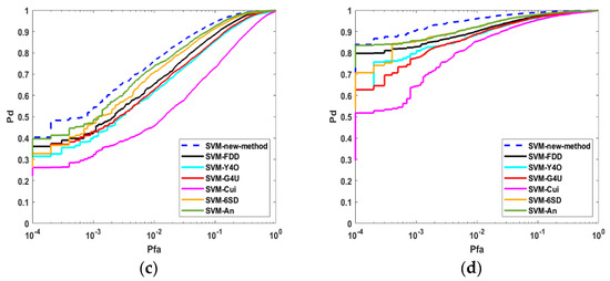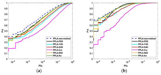 The receiver operating characteristic (ROC) curves of detectors in different scenes are presented in Figure 6, Figure 7, Figure 8 and Figure 9. “Pd” is the probability of detection and “Pfa” means the PFA. In “CWTW”, “C” stands for the clutter, “T” stands for targets, and “W” stands for Wishart distributed. “CWTW” denotes both targets and clutter are Wishart distributed. In “CKTG”, “K” represents -distributed, and “G” represents -distributed. “CKTG” denotes that the clutter is -distributed and the targets are -distributed. The other two are the same, and will not be repeated here.