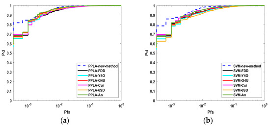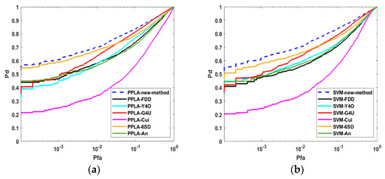 ROC curves of different decomposition methods in the AIRSAR image. (a) ROC curves of PPLA; (b) ROC curves of SVM.
