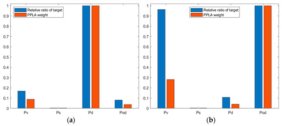 PPLA weight and relative ratio of targets in measured data. (a) RS-2; (b) AIRSAR.
