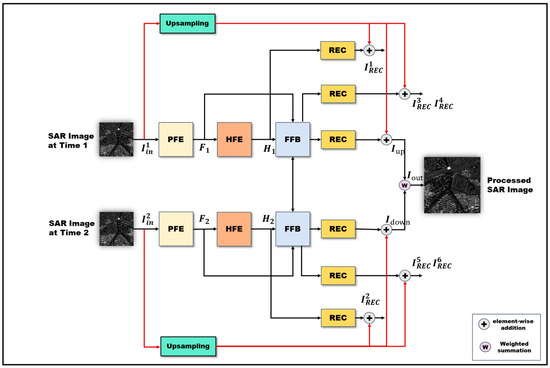 Given that these two tasks mutually reinforce each other, it is essential to develop a novel approach that integrates them into a unified deep learning model. Therefore, this paper proposes ISSMSAR. The objective of this network framework is to process two input multi-temporal SAR images. Through a series of processing modules, including PFE, HFE, FFB, and REC, the aim is to obtain the final high-quality SAR image.