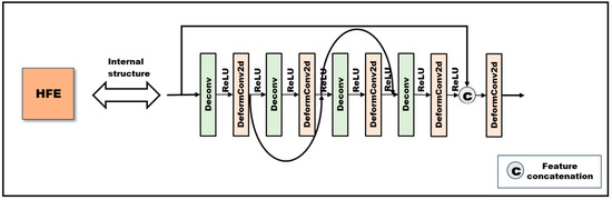 In the HFE, a clever fusion of techniques including deconvolution, deformable convolution, and skip connections is employed to precisely extract more complex and abstract features from SAR images.