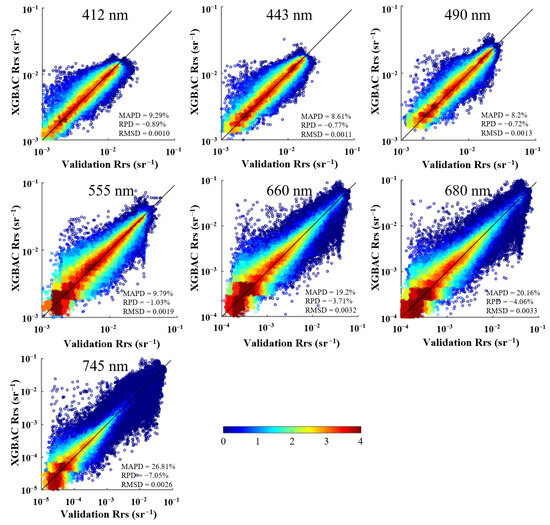 Scatterplots of Rrs (λ) retrieved by the XGBAC model vs. the reference values in the training dataset at each GOCI band. The numerical values along the colour bar correspond to the pixel density on a logarithmic scale.