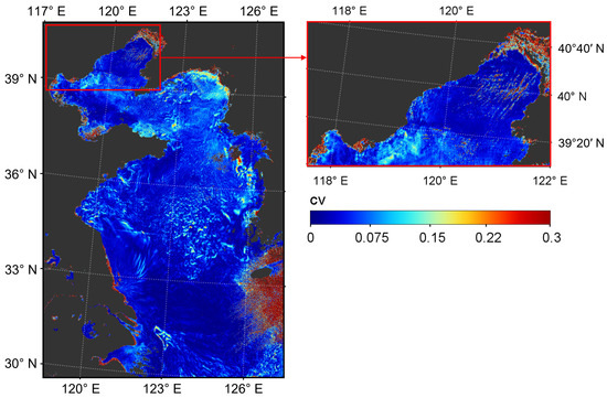 The temporal CV of the pixel values examined using multiple noontime (10:55 LT–13:55 LT) Rrs (555 nm) values within a day.