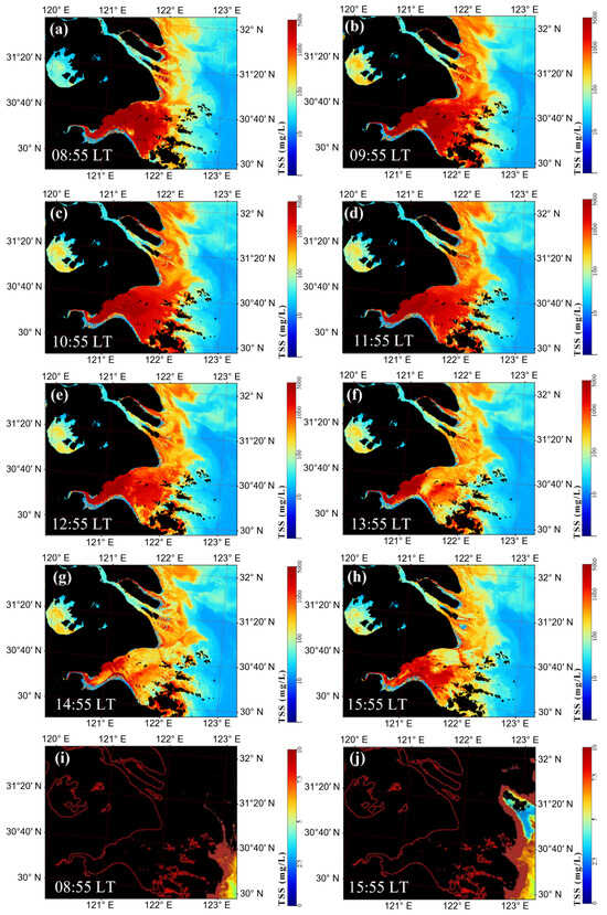 The YRE and HZB is one of the most turbid regions with sediment-laden waters in the world [46], making the standard AC algorithms invalid [47,48]. Using the Rrs data retrieved by the XGBAC and the regional TSS model following Equation (6), we obtained hourly TSS concentration maps in the YRE and HZB at every 1 h from 08:55 LT to 15:55 LT on 13 January 2021 (shown in Figure 11a–h). There are no retrievals in the YRE and HZB regions on the KOSC TSS products at 08:55 LT and 15:55 LT (shown in Figure 11i,j). With the XGBAC, the first noticeable aspect is the recovery of the area that had a previous algorithm failure in the GOCI-derived TSS, as well as significantly changed values in the regions after the correction. The TSS concentration throughout the HZB was over 100 mg/L, and even over 1000 mg/L in most areas. High TSS concentrations in the HZB were probably caused by the re-suspension of sediment by strong tidal currents and wind. The spatial distribution of TSS concentration in this area is similar to the previous study [14,49], where a higher TSS concentration was observed for coastal waters and decreased in moving further away from the outer shelf area. It is also evident that TSS values around the YRE are also significantly increased due to improved Rrs, and numerous plumes of TSS are also clearly present in the coastal region with TSS concentrations ranging from 50 to 500 mg/L. This result can assist environmental management agencies in understanding the intra-day fluctuations of TSS to make better decisions to safeguard coastal ecosystems. Compared to the KOSC standard products, there are obvious improvements in GOCI ocean colour products after applying the XGBAC.