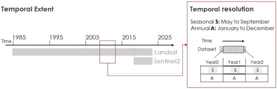 Images with cloud cover greater than 20% were excluded from Landsat and Sentinel-2 collections. A spatial clip was applied to the selected images, limiting the region of interest on each river reach. Moreover, the CFmask algorithm [], which is based on pixel quality assessment, is applied to each Landsat image in the collection to mask cloud obstructions and cloud shadows. An analogous cloud mask is applied to Sentinel-2 images by filtering clouds and cirrus directly from the image metadata information. The two temporal synthetic resolutions compared in this work are the Seasonal—covering the vegetative season (May to September)—and the annual (January to December), for each year of the considered temporal extent, set from 1985 to 2022, with Sentinel-2 images available from 2018 (Figure 1).
