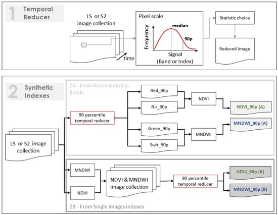 Workflow to obtain synthetic representative images of NDVI and MNDWI composites and to assess their difference. Panel 1: Temporal reducer over an ImageCollection. Panel 2: Synthetic images approaches compares: Panel 2A showsthe traditional approach of representative bands and Panel 2B outlinesthe proposed novel approach that reduces single images multispectral indexes.