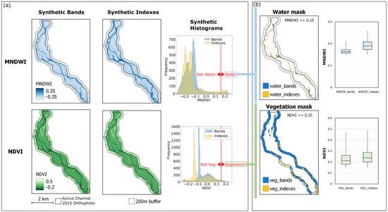 A fixed threshold of MNDWI is set to quantitatively compare the two approaches. The threshold is set to 0.15, which is conservatively lower than the 0.2 value suggested for water detection by [], to investigate the different MNDWI values in correspondence of water boundaries. The results show that the extent of water and vegetation is higher with the indexes approach (Figure 4, Panel b, yellow area). Moreover, all water and vegetation pixels detected with the synthetic bands (Figure 4, Panel b, light blue) are also masked with those detected by the indexes approach (yellow). As for the NDVI threshold, every pixel with an NDVI value higher than 0.15 is classified as vegetation [,]. Looking at the NDVI and MNDWI values within the masked water and vegetation pixels, it can be seen that the masks obtained from the indices have slightly higher values in their distributions. This difference is more pronounced for the MNDWI index (Figure 4, Panel b).