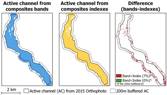 Moreover, Figure 5 shows that the indexes approach identifies a more accurate extraction of the active channel (water and sediment areas) compared to that obtained with the bands approach. The difference Panel in Figure 5 highlights that the differences in the classification are mainly located in the lateral buffer and correspondence of riverine islands.