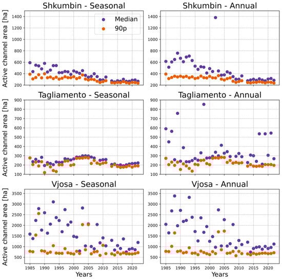 Multitemporal active channel area [ha]: Median and 90th percentile comparison, with frequency threshold t = 27%.