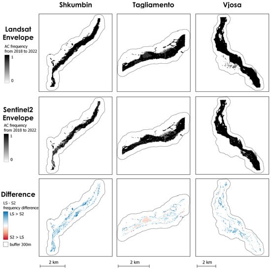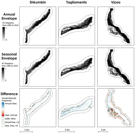 The annual-derived envelope includes all months in the active channel computation, while the Seasonal-derived envelope is restricted to the vegetative season (May to September in the selected case studies). They are compared in Figure 8 and Table 3 considering the region obtained by merging the 90th percentile annual envelope with a 300 m buffer to focus on the riverscape and its nearbies. Setting an appropriate threshold to define the multitemporal active channel from the frequency envelope (e.g., t = 27%) does not significantly change the multitemporal active channel area with respect to the annual envelope (1.5 to −1.3% difference, Table 3). Limited discrepancies in the active channel delineation can be detected in the lateral boundaries or in correspondence of vegetated islands and bars due to the different values between the Seasonal and Annual NDVI representative images (Figure 8). The difference between the Annual and Seasonal envelopes shows a higher frequency of the Annual envelope (difference > 0) within the active channel and higher frequencies of the Seasonal envelope (difference < 0) outside the active channel. This is especially noticeable for the Shkumbin and Vjosa floodplains, in correspondence with cultivated areas, while it is less visible for the Tagliamento River, where the difference is almost nonexistent. This can be explained by the different land use (more forested parts along the river and less agricultural areas) and climate (more continental and less Mediterranean) of the Tagliamento with respect to the two Albanian rivers.