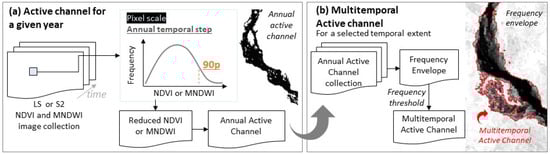 We focus here on the possibility given by GEE to work with synthetic representative images, where all images acquired in a defined temporal interval are reduced together to obtain a more robust synthetic representative image. From the obtained representative image, we propose an approach to extract a specific element of any riverscape, the active or erodible corridor [], which we identify as the multitemporal active channel. In 2013, Ashmore described active channels as “those transporting bedload or showing measurable morphological change at a given time or during a given time interval” []. This definition highlights the need to contextualize not only the river system we consider in space and time but also the lenses we use to observe morphological change. Thus, we consider an active channel as part of a river landscape that experiences measurable morphological planform changes through medium-resolution remote sensing imagery. Using this definition, we aim to explore the capabilities and limitations of the Google Earth Engine (GEE) cloud computing platform in supporting the detection of total active channel area and how it changes over different temporal scales.