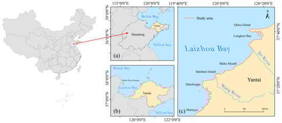 Regional framework of the study area: (a) Bohai Bay and Shandong Province; (b) Laizhou Bay and Yantai. (c) The analyzed coastline.