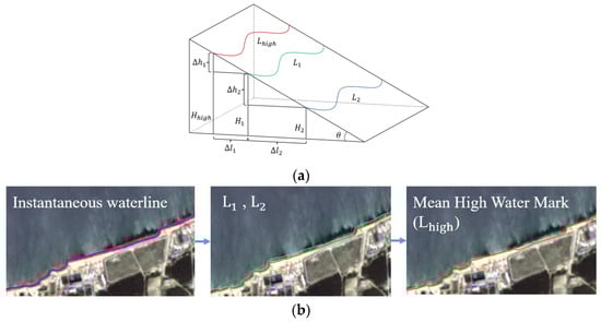 The extracted shoreline position represents the instantaneous water boundary recorded by the satellite sensor and not the actual coastline at the MHWL, i.e., the intersection of the plane of the MHW tidal datum with the shore. Therefore, a tidal correction is performed to determine the actual coastline position (Figure 2).