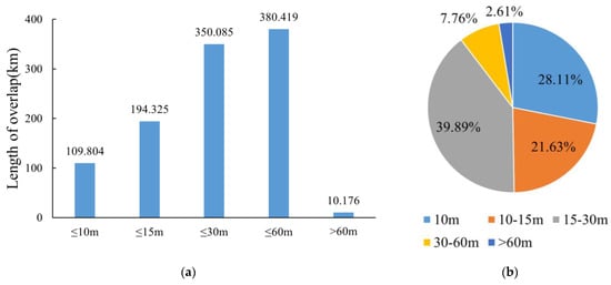 Results of the accuracy assessment of the extracted shorelines: (a) length of overlap in different buffer zone ranges; (b) proportion of overlap length.