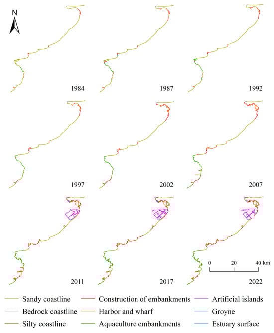 The extracted shorelines from nine periods were classified according to the classification criteria in Table 1. The lengths of the different types of the shorelines were then calculated for each corresponding year, resulting in the spatiotemporal distribution characteristics of shoreline types in the different periods (Figure 4). The results show that the shoreline length on the eastern coast of Laizhou Bay generally increased from 166.90 km to 364.20 km, between 1984 and 2022. The total length of natural shorelines shows a decreasing trend by 63.62% from 139.09 km in 1984 to 50.60 km in 2022. On the other hand, the total length of artificial shorelines increased by 1024.82% from 27.81 km in 1984 to 313.60 km in 2022.