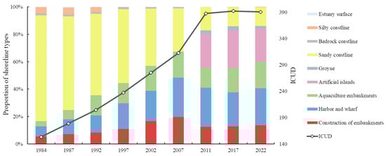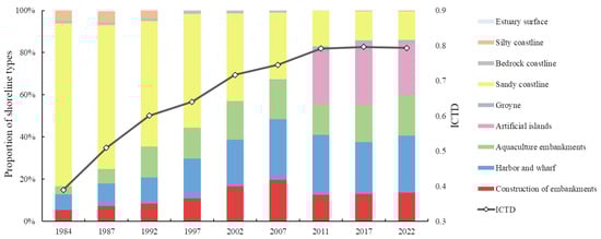 The overall distribution of the nine coastline types has changed considerably between 1984 and 2022 and the ICTD trend has increased (Figure 5). In the period 1984–1997, the proportion of sandy coasts, which almost always represents natural beaches, exceeded 50%, and human activities were relatively limited, resulting in a lower ICTD level. Over time, human activities increased, leading to a strong diversification of coastline types, with the proportions of various coastline types becoming more balanced and resulting in a gradual increase in ICTD.