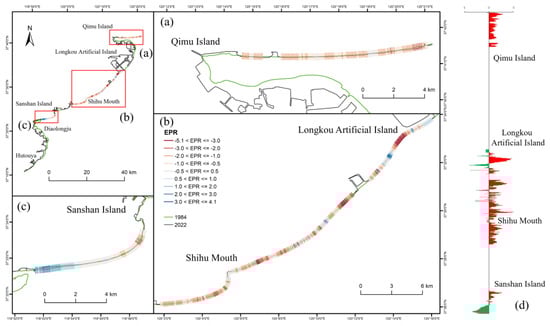 The EPR of the sandy shoreline from 1984 to 2022 in the (a) northern, (b) central, (c) southern of the survey area, and (d) rate of change ().