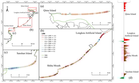 The LRR of the sandy shoreline from 1984 to 2022 in the (a) northern, (b) central, (c) southern of the survey area, and (d) rate of change ().
