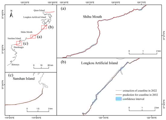 Prediction of the sandy coastline evolution in 2032 for (a) Shihu Mouth, (b) Longkou Artificial Island, (c) Sanshan Island.