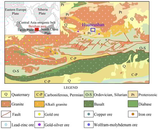The Beishan area, situated at the convergence of the Tarim plate, North China plate and Central Asia orogenic belt, represents a multi-cycle composite orogenic belt and is a multi-cycle composite orogenic belt [37]. The Huaniushan Au–Ag–Pb–Zn deposit is located in the western part of the Beishan area. Its geotectonic location belongs to the Dunhuang landmass in the northeast of the Tarim plate (Figure 2). The Dunhuang landmass is mainly composed of the hypo-metamorphic rocks of the Archaean Dunhuang Group. In the Mesoproterozoic period, the ancient land began to break apart and developed a set of shallow marine carbonaceous clastic and carbonate rock formations with a small number of intermediate basic volcanic rocks. The regional structure is controlled by an ENE-trending deep fault.