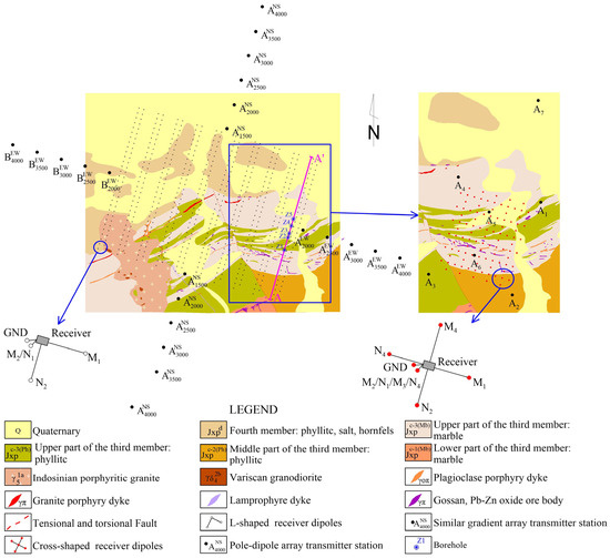 Geological and array arrangement map [39]. Data collection in the study area was conducted using the expanding gradient array (the left image). Data collection in the blue-boxed area was carried out using the pole–dipole array (the right image).