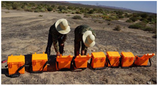 A distributed electromagnetic (DEM) system was used to collect 3D data. The DEM consisted of a transmitter (1600 V, 100 Amp) and many multi-channel receivers (two, three and eight channels) (Figure 4). The DEM can be used to collect full waveform data. Some authors argue that this system is capable of detection at a great depth [4,31].