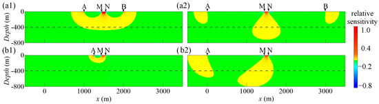 Sensitivity distribution of the different arrays. (a) Gradient array with AB = 1 km (a1) and AB = 3 km (a2); (b) pole–dipole array with AM = 0.2 km (b1) and AM = 1.5 km (b2).