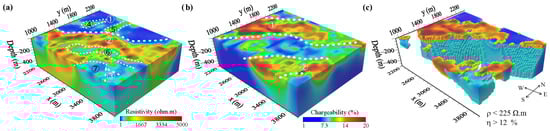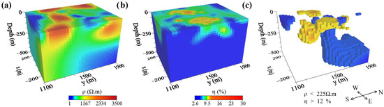 3D inversion results from the pole–dipole array. (a) 3D distribution of the resistivity; (b) 3D distribution of the chargeability; (c) 3D morphology of the low-resistance and high-chargeability bodies. In panel c, the low-resistivity bodies (less than 225 Ω·m) are displayed in cool colors, consistent with the color bar in panel a. The high-chargeability bodies (greater than 12%) are displayed in warm colors, consistent with the color bar in panel b.