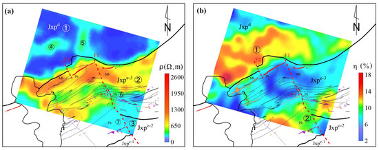 The inversion results of the expanding gradient array presented as a horizontal slice along the depth of 80 m, where (a) represents the resistivity and (b) represents the chargeability deep slices along z = 80 m. Zone ①–⑦ represent chargeability anomalies.