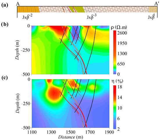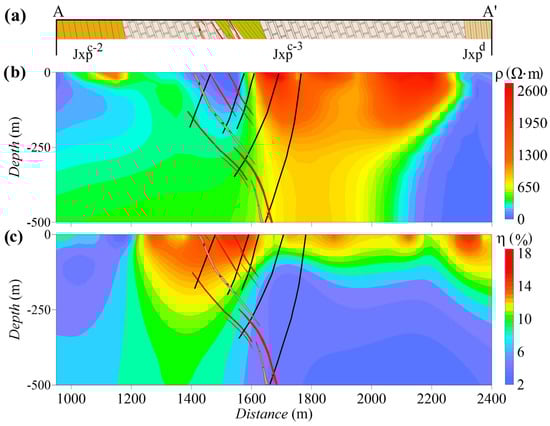 Slices of the 3D inversion results with a pole–dipole array along line AA′. (a) Geological profile; (b) resistivity profile; (c) chargeability profile.