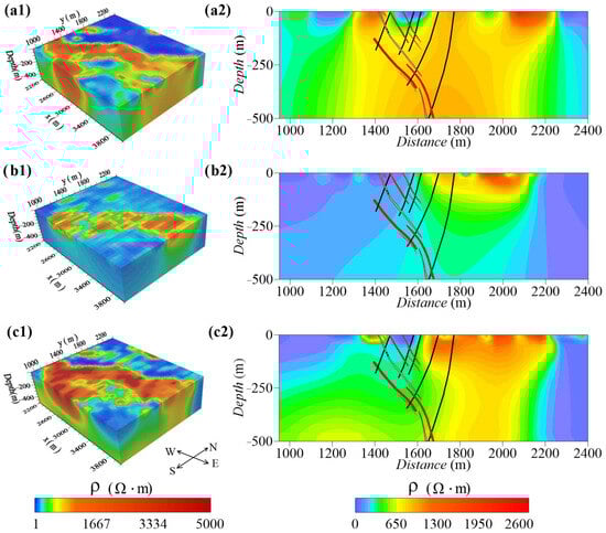 Inversion results using different data combinations with an expanding gradient array. (a1) is the 3D distribution of the resistivity with the nearly N–S-trending transmitter and nearly N–S-trending receiver. (b1) is the 3D distribution of the resistivity with the nearly E–W-trending transmitter and nearly E–W-trending receiver. (c1) is a 3D resistivity model obtained by combining the data used in Figure 13a and Figure 13b for inversion. (a2), (b2) and (c2) are the slices of (a1), (b1) and (c1) along line AA′, respectively.