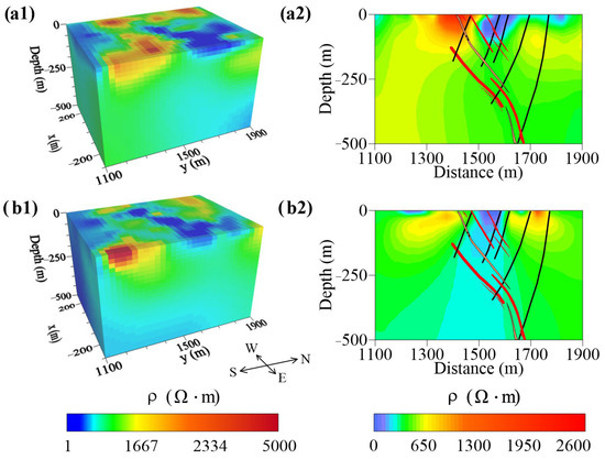 Inversion results using different data combinations with the pole–dipole array. (a1) and (b1) are the resistivity inversion results of the nearly S–N-trending and E–W-trending data, respectively. (a2) and (b2) are the slices of (a1) and (b1) along line AA′, respectively.