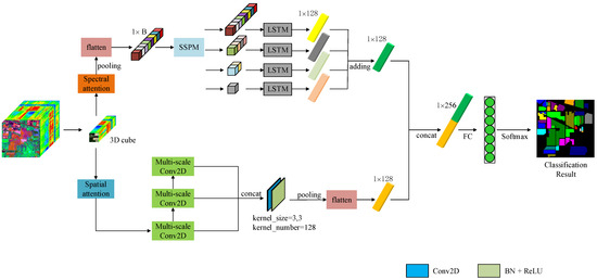 (1) We propose the spectral–spatial double-branch network (SSDBN) for HSI classification. This network is designed as an end-to-end HSI classification system that incorporates attention mechanisms, LSTM, and multi-scale 2D convolution. It discards multi-scale 3D convolution and serially employs multiple multi-scale 2D convolution modules. Moreover, the network fuses the outputs of multi-level multi-scale modules to extract spatial features and it utilizes the spectral sequence processing module (SSPM) and LSTM modules to extract spectral features. The whole network can maintain an excellent classification performance while significantly reducing the number of parameters;