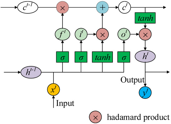 However, RNNs inevitably face the issue of gradient disappearance or explosion during backpropagation, so it is difficult to handle long sequences of data. To address this thorny problem, ref. [30] proposed the LSTM, which can avoid the gradient vanishing of traditional RNN, addresses the issue of long dependencies in RNNs, and is widely applied to various tasks, such as natural language processing [31] and financial market change prediction [32]. The general structure of LSTM is depicted in Figure 3.