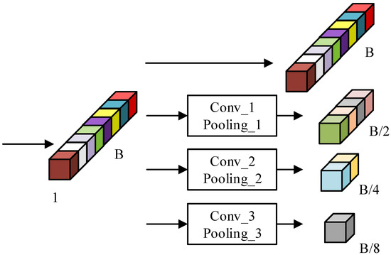 Illustration of SSPM. The spectral sequence of size B is processed through four paths into four subsequences of size B, B/2, B/4, and B/8, where the subsequence of size B is identical to the original spectral sequence. Conv_1, Conv_2, and Conv_3 are all 1D convolutions with kernel_number = 1 and kernel_ size = 3. Pooling_1, Pooling_2 and Pooling_3 are 1D average pooling layers with kernel_sizes of 2, 4, and 8 and strides of 2, 4, and 8, respectively.