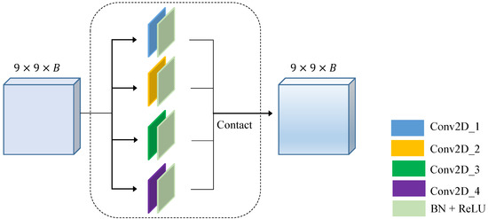 The input data of shape 9 × 9 × B is sent to the multi-scale convolution module. Since each multi-scale convolution performs the corresponding padding operation during feature extraction, the outputs of the four 2D convolutions are of equal size and, by concatenating these four outputs in the channel dimension, the resulting output size is equal to the input size, i.e., 9 × 9 × B.