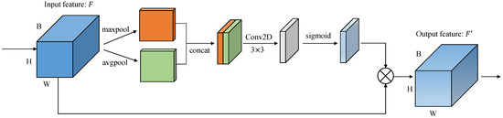 The spatial attention mechanism aims to identify regions within the feature map that deserve focused attention. The convolutional block attention module (CBAM) [38] is a simple but efficient lightweight attention module. In the spatial dimension, given an feature F, two channel descriptions are first obtained by averaging pooling and max pooling in one channel dimension, respectively, and these two descriptions are stitched together by channels. Then, after a 2D convolution with the sigmoid activation function, the obtained weights are multiplied with the input features to obtain the adaptive refinement features. The spatial attention module used in the proposed method is schematically shown in Figure 7.