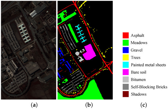 Detailed information of the UP dataset. (a) False-color image. (b) Ground truth. (c) Labels illustration.