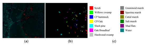 Detailed information of the KSC dataset. (a) False-color image. (b) Ground truth. (c) Labels illustration.