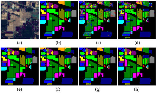 Classification maps on IP dataset. (a) False-color image. (b) Ground truth. (c) SVM-RBF. (d) M3D-CNN. (e) SSRN. (f) HybridSN. (g) DBMA. (h) Proposed.