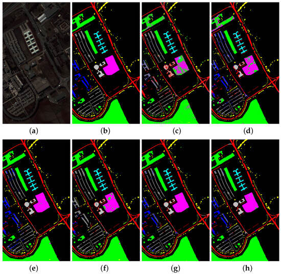 Classification maps on UP dataset. (a) False-color image. (b) Ground truth. (c) SVM-RBF. (d) M3D-CNN. (e) SSRN. (f) HybridSN. (g) DBMA. (h) Proposed.