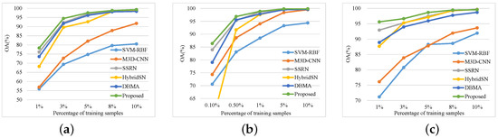 OA of different methods with different proportions of training samples on the datasets of (a) IP, (b) UP, and (c) KSC.