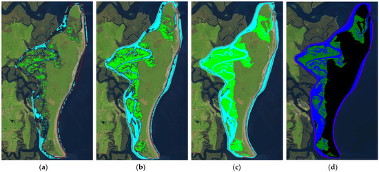 - Schwarz, C.; van Rees, F.; Xie, D.; Kleinhans, M.G.; van Maanen, B. Salt marshes create more extensive channel networks than mangroves. Nat. Commun. 2022, 13, 2017. [Google Scholar] [CrossRef]