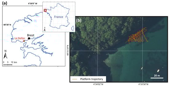 Field site at Dellec bay in Northwest Brittany (France). (a) Map of France and western part of Brittany. (b) Orthophotography of the field survey area (source: Bing Maps Aerial) and trajectory (about 450 m) of the POSEIDON system on 14 February 2023.